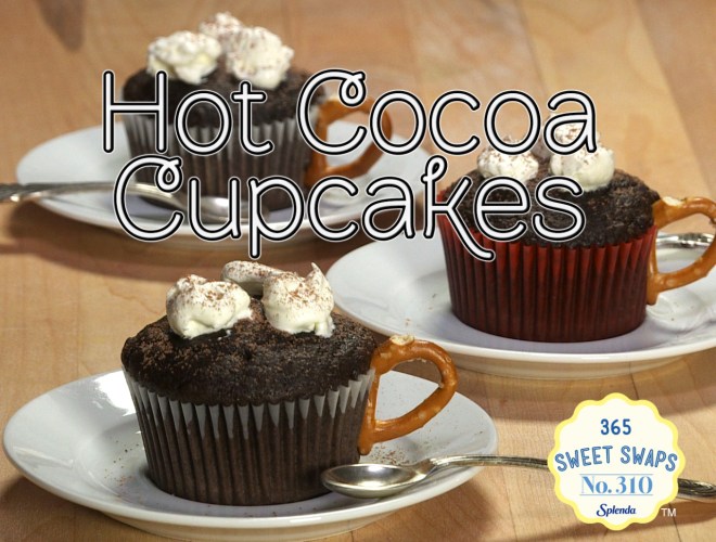 If you love the flavors of hot cocoa, then you’ll love these clever hot cocoa cupcakes. Bake chocolate cupcakes and swap full sugar for SPLENDA® Sugar Blend. Instead of frosting, top the cupcake with a dollop of lite whipped topping and use a small pretzel twist to create a handle for your “cup” of cocoa cupcake.
