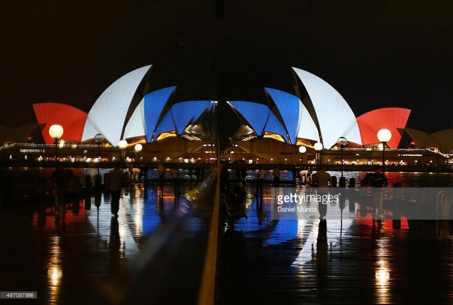 The sails of the Sydney Opera House are illuminated in the colours of the French flag on November 14, 2015 in Sydney, Australia. At least 120 people have been killed and over 200 are injured in Paris following a series of terrorist acts in the French capital on Friday.