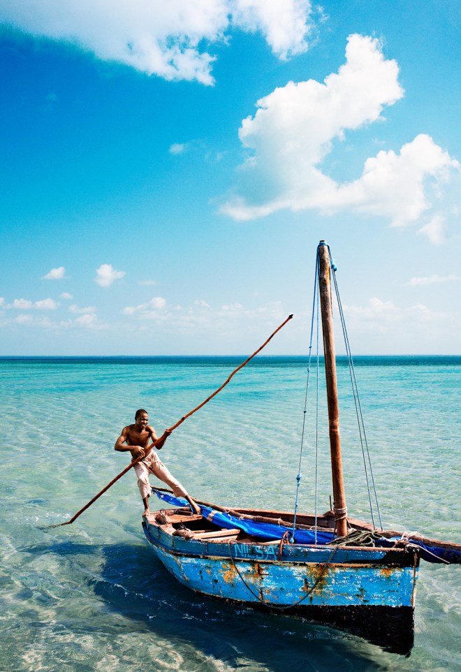 Southern Africa’s Beaches and Safari Camps | A dhow in the waters around Benguerra Island. At high tide, the channel here turns into a fish funnel. Dolphins dance around at sunset, and then Azura Benguerra will serve you dinner at tables set out in the shallow water.